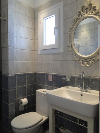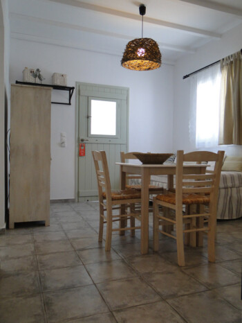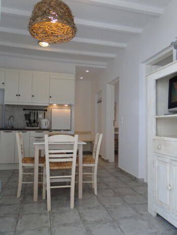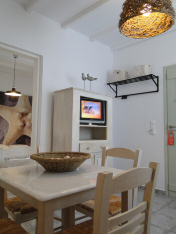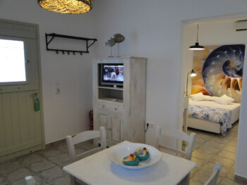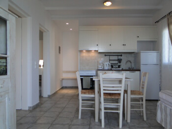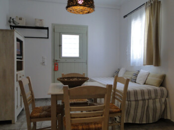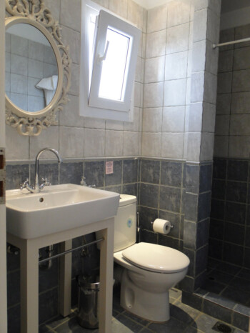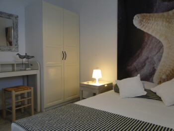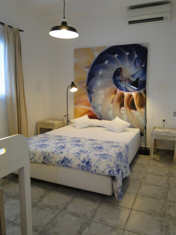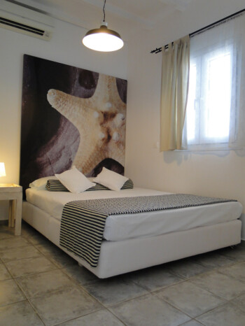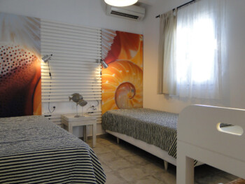 Our 2 bedroom apartments are located on the 1st floor of our premises and accommodate 4-5 persons. There is 1 double bed, 2 single beds and 1 single bed in the living room area (with new Elite Strom mattresses). There is also a fully equipped kitchen with refrigerator, stove, kettle, coffee maker, kitchen utensils and pan and pots and storage cupboards and a kitchen table. All rooms are equipped with A/C and there is a private bathroom with shower, a 20” flat TV and access to the balcony and the sea view.